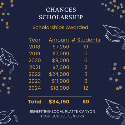 The Chances Scholarship program has grown tremendously since its humble beginnings in 2013 as a Platte Canyon Chamber of Commerce committee dedicated to helping local students access educational opportunities. In January 2018, Chances was officially registered as a 501(c)(3) nonprofit organization, and since then, it has continued to expand its impact, providing crucial financial support to Platte Canyon High School seniors pursuing their dreams.