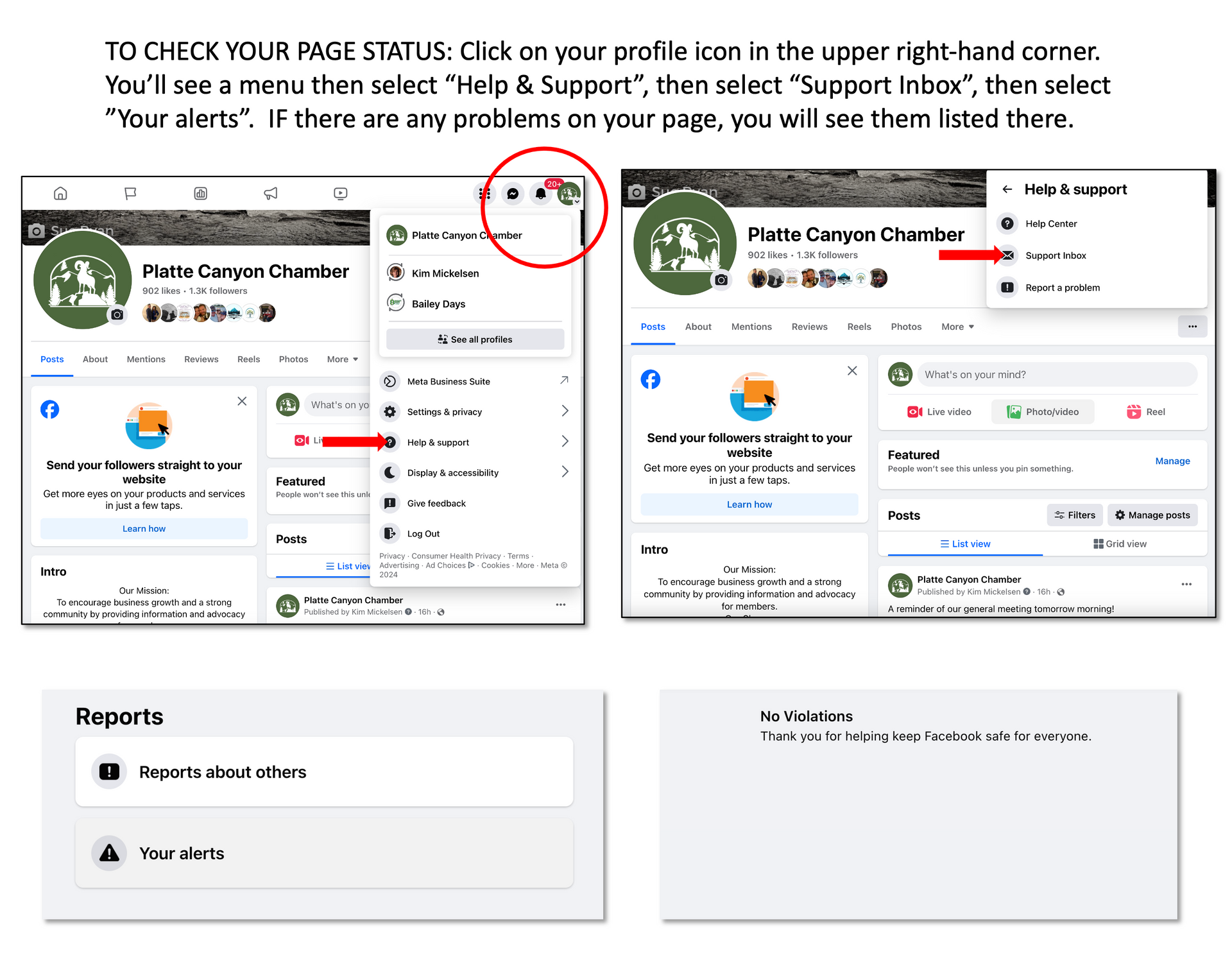 You can easily check to see if your page has any violations. Simply go to your Facebook page, click your profile icon in the upper right hand corner. A menu will appear, select "Help & Support", then "Support Inbox", then "Your alerts". Any problems with your page will show up there.