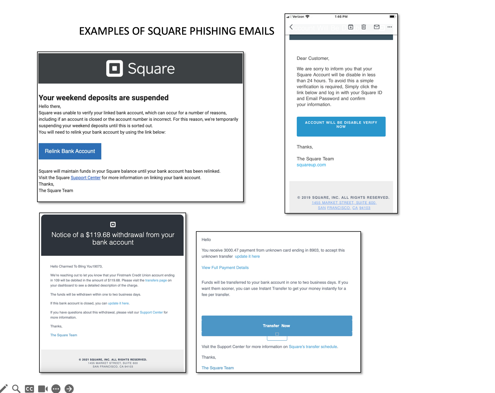 Recently there have been reports of a phishing emails and scams where you get an email notice from Square saying your payments processing has been disconnected from your bank account, and to click to reconnect. Don't click! These notices and emails often look official and some even spoof the SquareUp domain. See examples below.